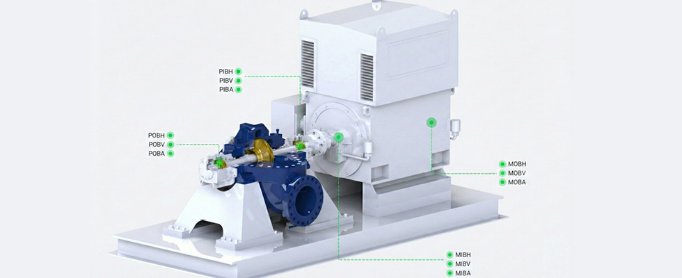The asset in question was a horizontal, single stage BB1 pump running at mostly fixed speed. Four wireless triaxial accelerometers were mounted at key bearing locations on both the pump and motor housings. Each sensor captured vibration across multiple frequency ranges and also tracked surface temperature.